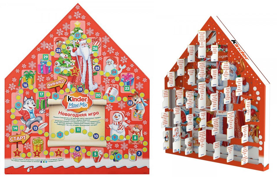Некоторые издательства выпускают к Новому году адвент-календари с окошечками, за которыми помещен текст. Обычно это небольшие задания для ребенка, загадки, стихи или сведения об этом дне.