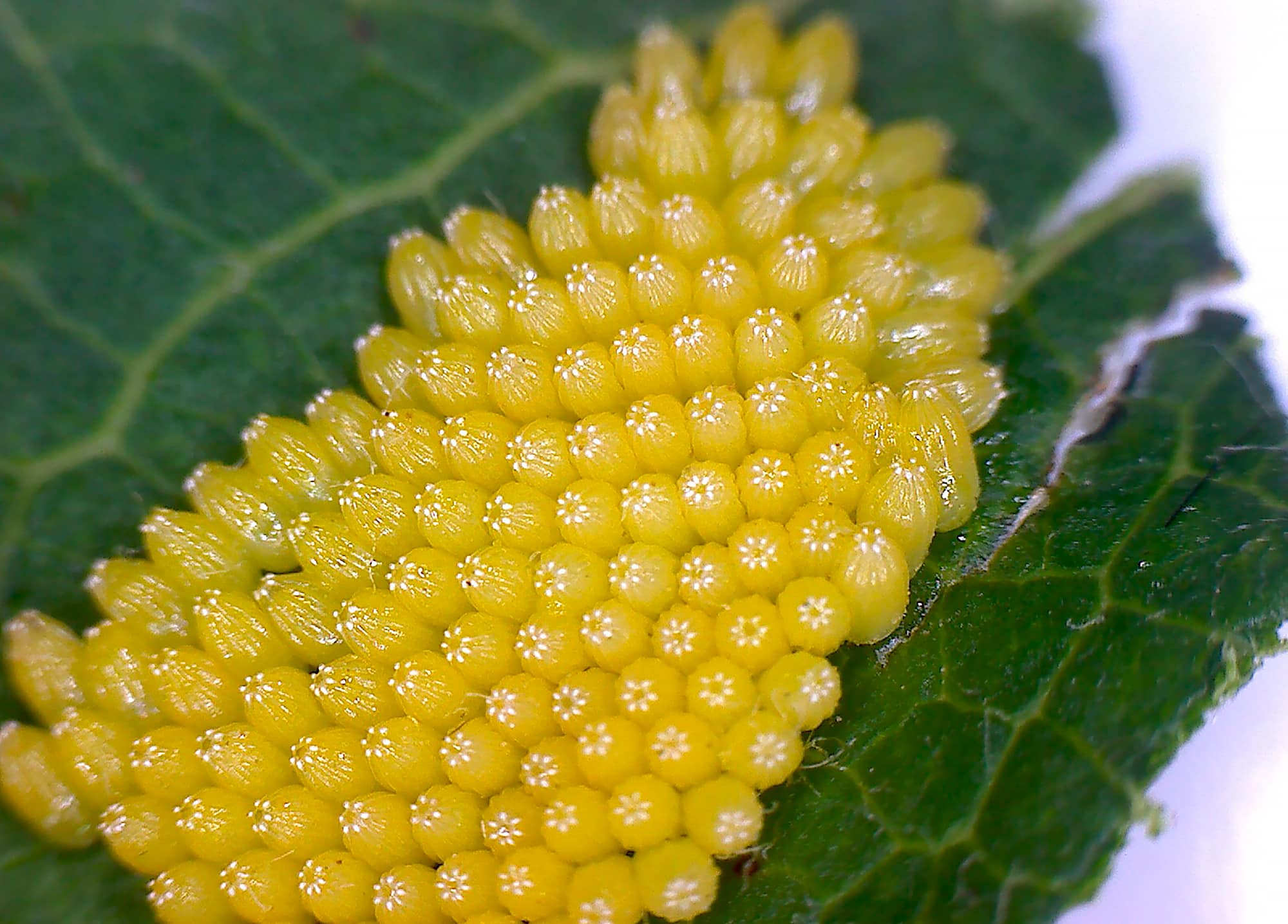 Яйца бабочки на внутренней стороне листа растения