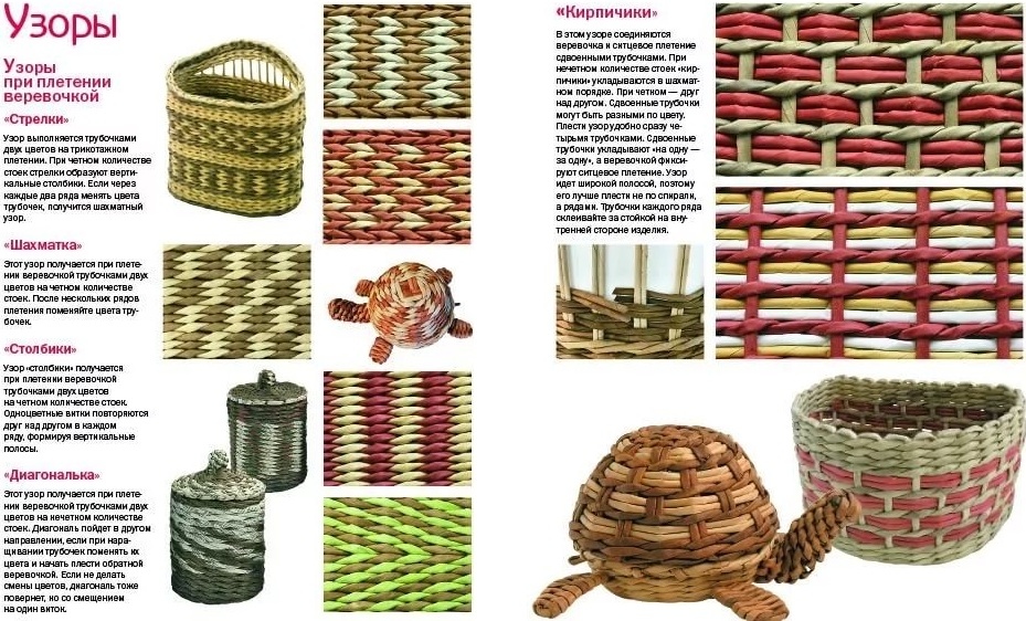 Все плетения имеют дно и каркасную основу, от которой идет построение узора. Кто-то предпочитает в качестве основы использовать плотный картон, приклеивая к нему трубочки, играющие роль каркаса. Кто-то формирует дно из переплетения трубочек. Все зависит от мастерства и желания. Для начинающих мастериц, возможно, будет проще иметь дело с картонной основой. Вариантов плетений довольно много, все они придуманы давным-давно, и нового в них ничего нет. Самые популярные из них: