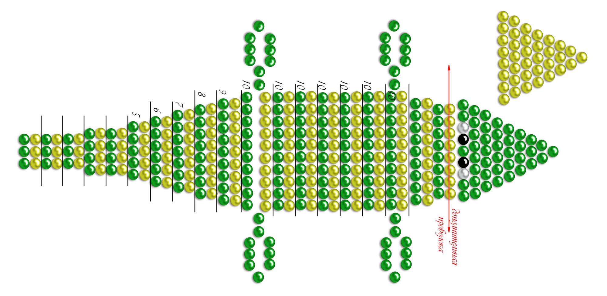 Схема, которой нужно придерживаться, выглядит следующим образом: 3-3-3-4-4-5-6-7-8-9-10. При этом каждый ряд дублируется обоими цветами, чередуясь между собой. Чтобы крокодил был объемнее и привлекательнее, его спину лучше отделить от брюха, просунув в него что-нибудь вроде карандаша или палочки от кисти. Это можно сделать, когда размеры будут позволять, в ширину от 4 бисерин. Карандаш или другой похожий инструмент придадут изделию округлую форму, а проволочный каркас сохранит ее.