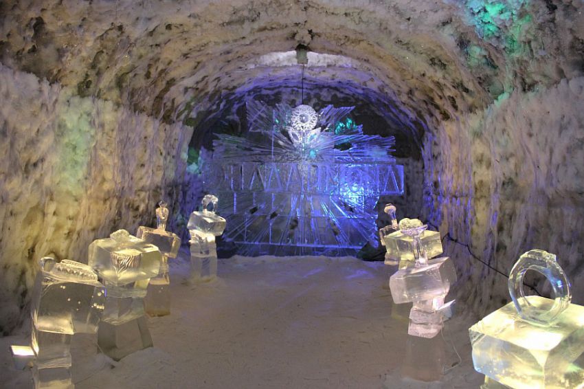 Сразу после усадьбы Атласовых направляемся в «Царство вечной мерзлоты». Оно представляет из себя лабиринт ледяных пещер внутри сопки, где в любое время года держится минусовая температура. Пещеры украшены красивыми ледяными фигурами, выполненные местными мастерами: даже летом здесь можно почувствовать себя в гостях у Деда Мороза или Снежной Королевы – кому что по душе.