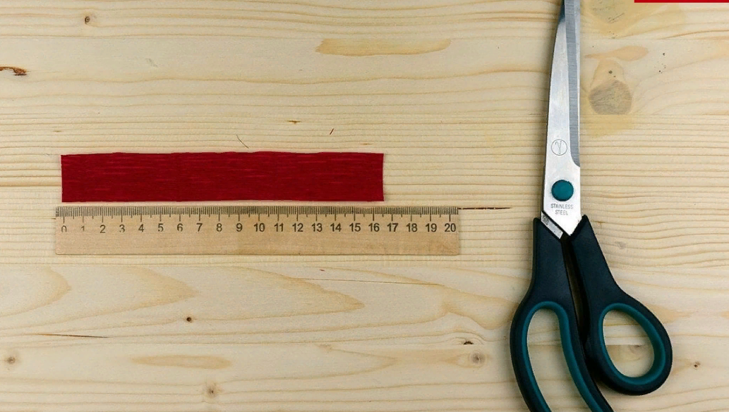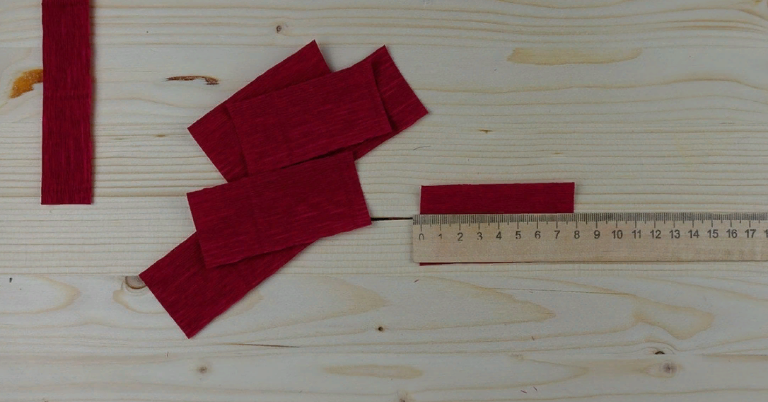 Бумагу алого цвета разрезаем на небольшие отрезки. Размер их должен соответствовать 16,5х2 см.