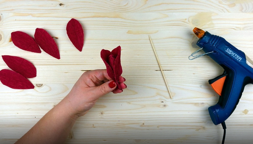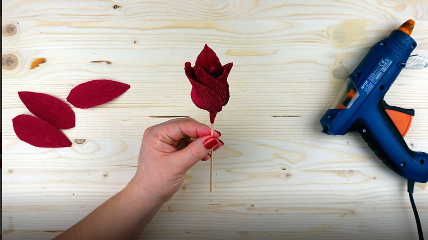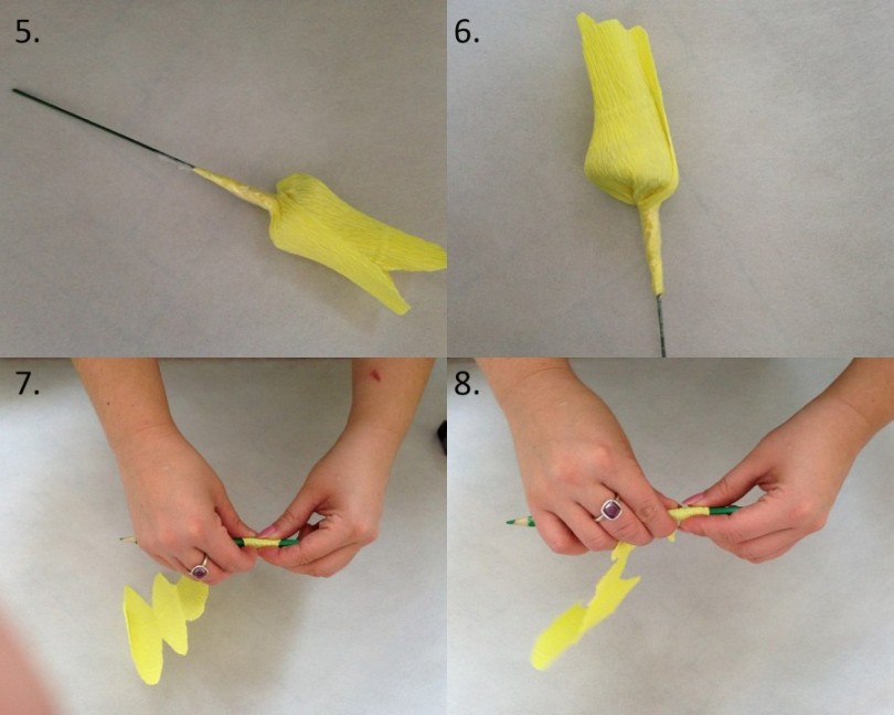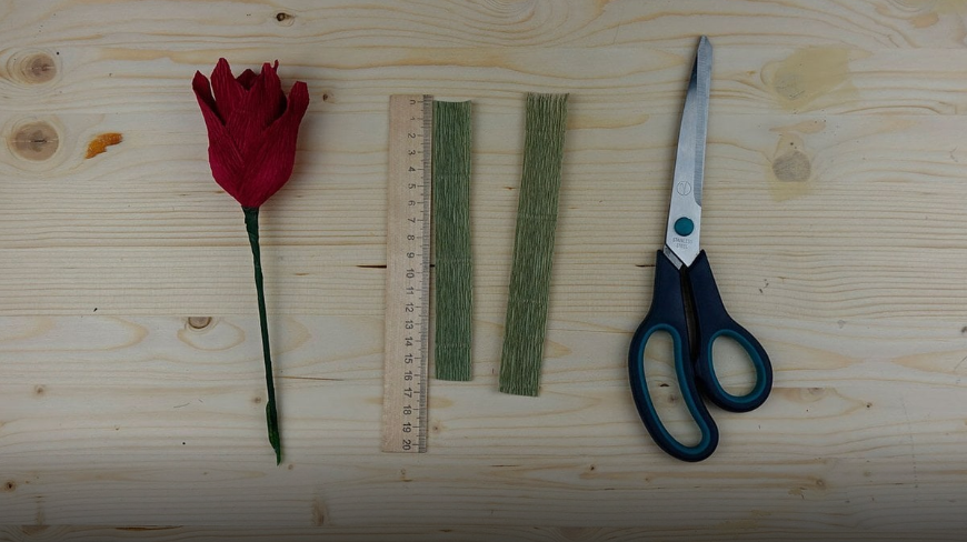 - Берем длинную полоску зеленой бумаги и оборачиваем вокруг стебля, закрепив концы с помощью капельки клея.