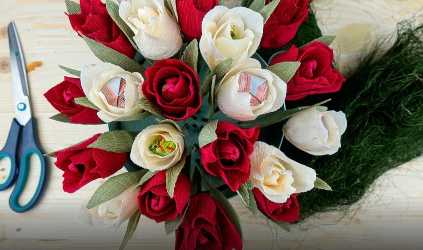 Букет из конфет в коробке «Розы» своими руками для начинающих – с пошаговыми фото