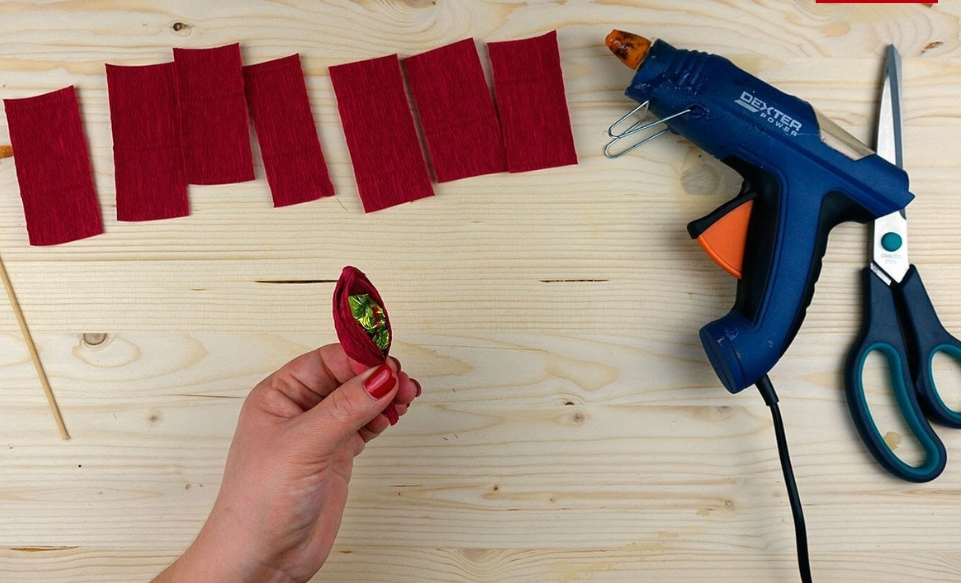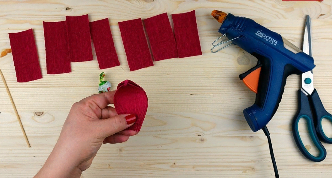 - Полученными лепестками оборачиваем конфету на шпажке, стараясь плотно обхватить «начинку».