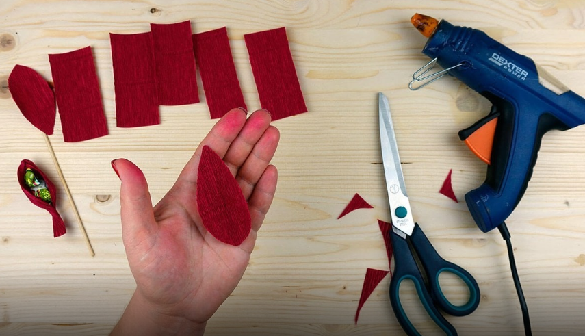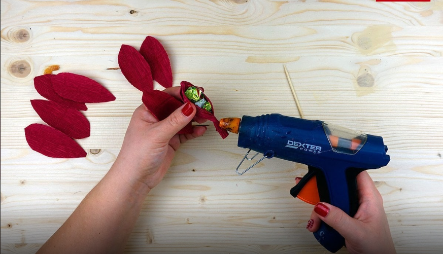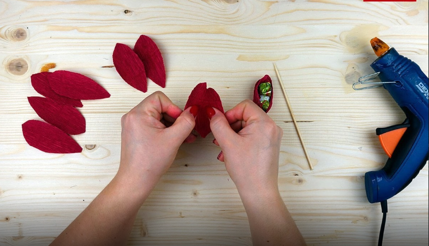 - Теперь вокруг конфеты поочередно закрепляйте лепестки, немного находя друг на друга (скрутка должна оказаться над конфетой).