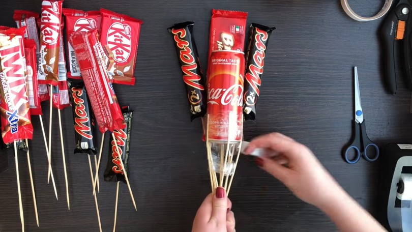 - К шпажке скотчем приклейте конфету за кончик фантика.