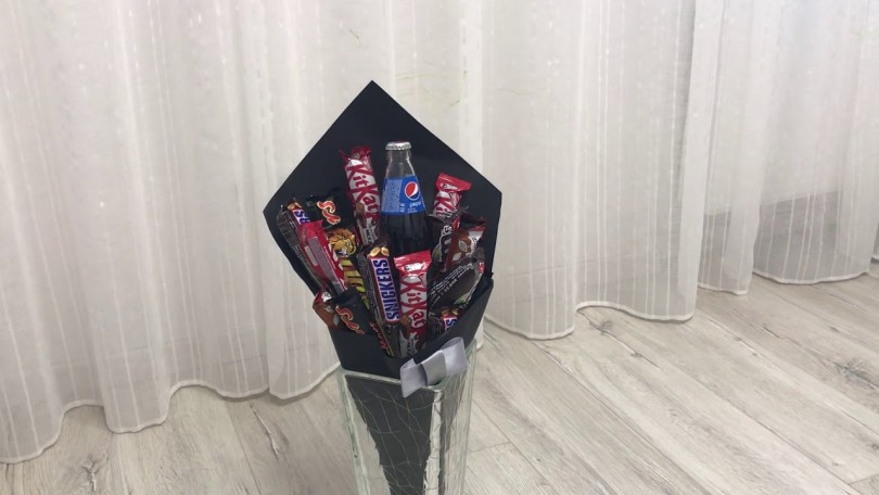 Для устройства такой композиции из конфет отнеситесь очень внимательно к выбору марки напитка и подслащенного компонента.
