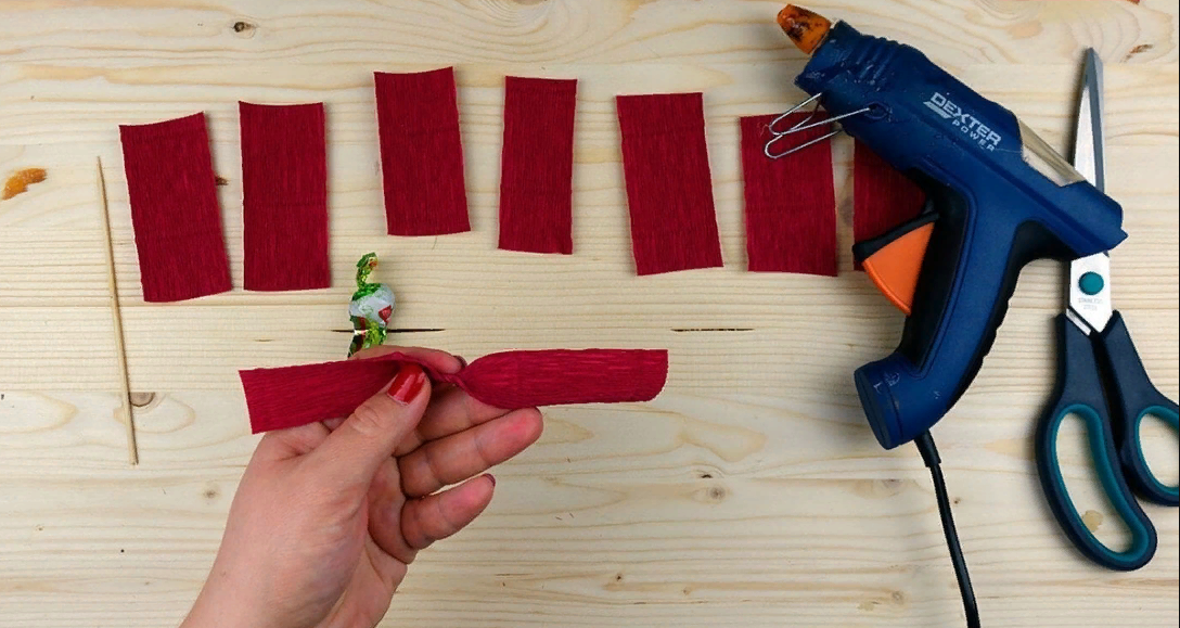 - Теперь бумажную заготовку плотно оборачиваем вокруг конфетки на шпажке, а внизу обвязываем нитью.