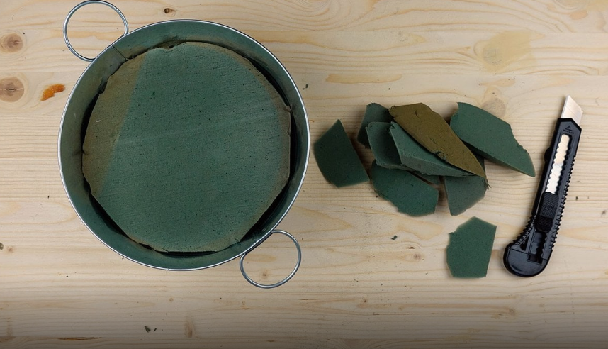 - Приступаем к изготовлению горшка. Для этого по форме подготовленной емкости вырезаем пеноплекс, помещаем его в горшок.