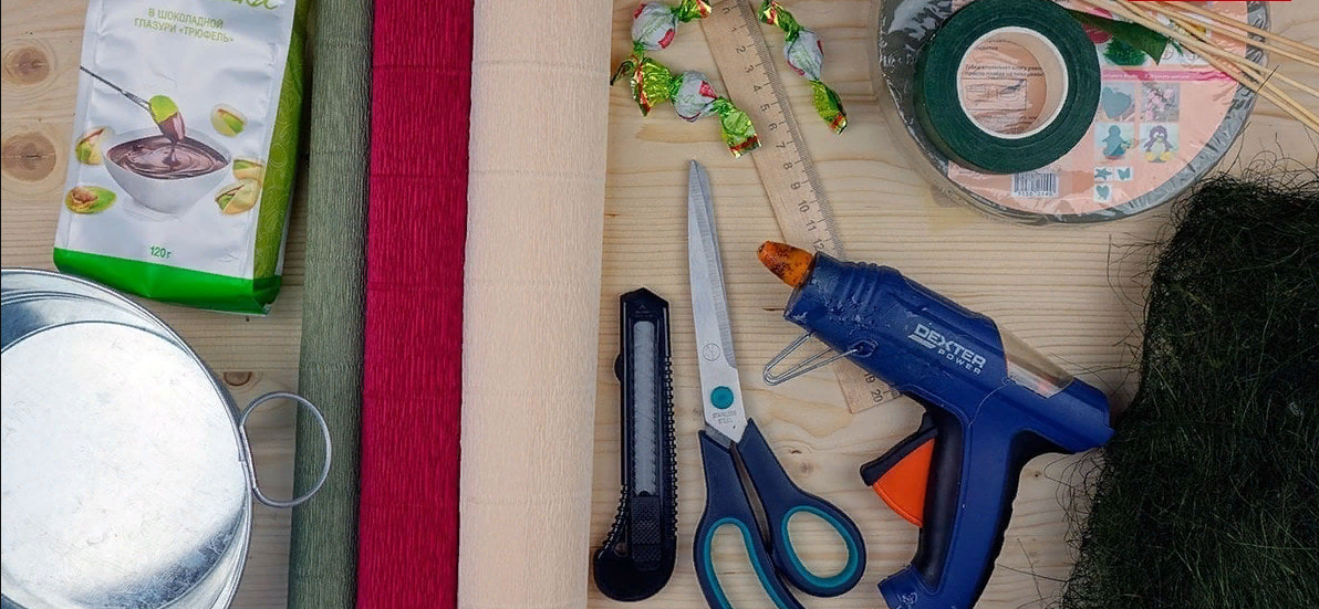 Перечень материалов для мастер-класса конфетного букета с розами в корзине: