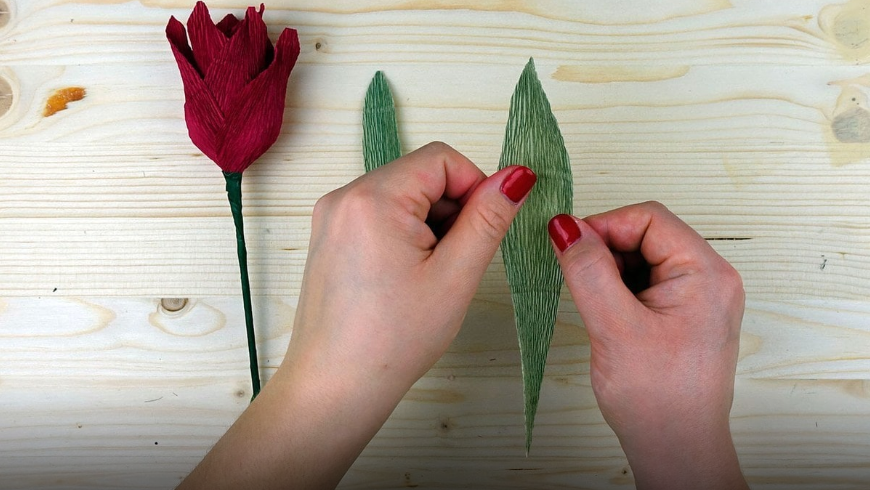 - Закрепите листья на стебле (тоже скруткой вверх).