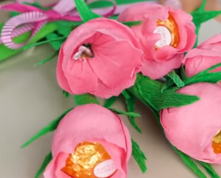 Достать конфетку из цветка очень просто: нужно обычными маленькими ножницами или пинцетом потянуть за верхний хвостик и она окажется снаружи, ведь мы конфетку не приклеивали, а просто завернули в бумагу.