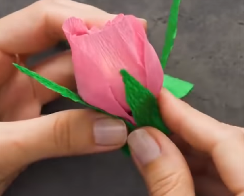 Чашелистики приклеиваем к основанию розочки, фиксируем несколькими оборотами нити и срезаем на уголок лишнюю бумагу.