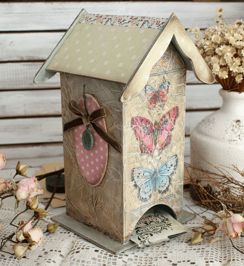 Чайный домик подходит для пакетиков и помогает не только создать уютную атмосферу, но и поддерживать порядок в таком важном месте дома. Оформить изделие в технике декупаж можно в любом стиле, который вам нравится и подходит к вашему интерьеру