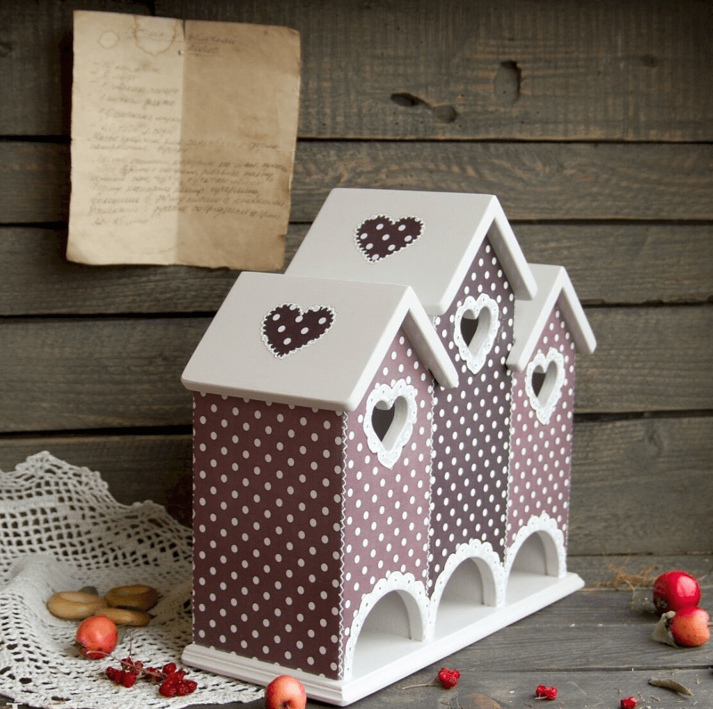 Удобно выполнять работу из деревянных заготовок, можно посмотреть разные варианты. Популярны изделия в виде мельницы, телефонной будки; мило смотрятся домики с балконом.