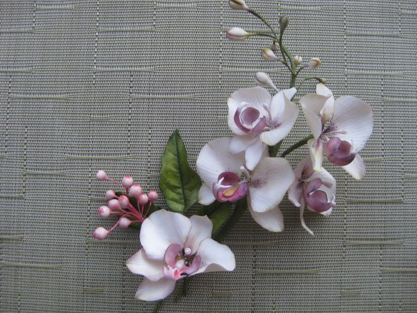 Безусловно, интереснее всего, когда мы не просто лепим отдельные цветки, а объединяем их в необычные разноцветные композиции или используем для создания аксессуаров или предметов декора. Например, холодный фарфор дает возможность создать нежный и изящный ободок с орхидеями. Список требуемых компонентов в данном случае является вполне обычным. Для работы потребуются: