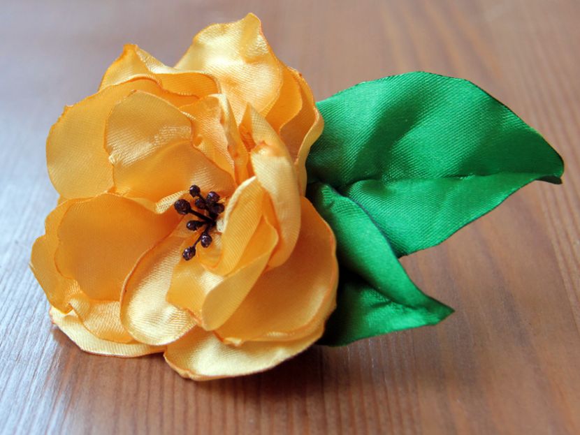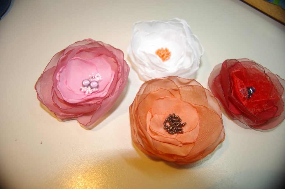 Эта техника универсальна, поскольку позволяет изготавливать цветы как из заготовок, вырезанных из ткани, так и применять ленты из органзы. Суть в том, что каждый лепесток представляет собой многократно сложенную ткань. Фиксировать отдельные элементы можно на нитку или подплавлять над пламенем края, таким образом склеивая их между собой.
