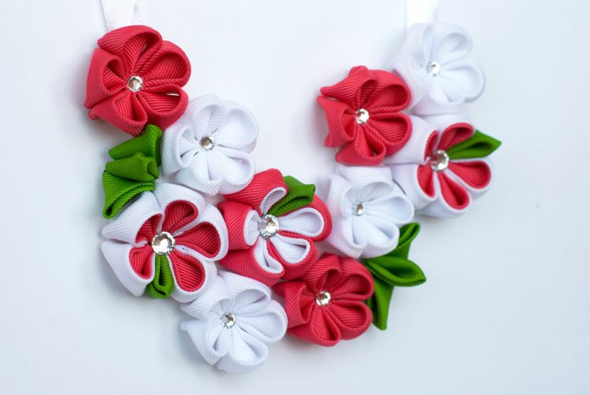 Нередко цветы являются частью композиции, например, украшением бантиков или сложных колье, где есть и другие детали. Достойный пример такого дуэта – бант с нежным цветочком посередине. Бантик, хорошо удерживающий форму, изготовлен из фоамирана, но подойдет и плотная лента.