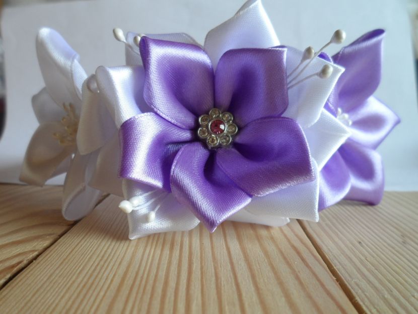 Эти нежные цветочки собираются из двух-трех оттенков фиолетового цвета, а на середину нужно приготовить отрезок тонкой желтой ленты. Вначале формируется внутренняя часть из двух полукруглых лепесточков одного цвета и одного овального лепестка более темного колера. Каждая заготовка собирается на нить, а потом все три части стягиваются вместе.