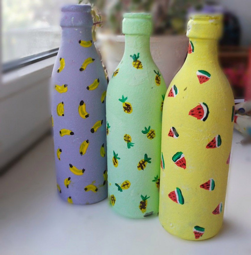 Важно выбирать для наклеивания рисунков однотонную поверхность и декорировать ее яркими, насыщенными цветами элементами. Для создания оригинального украшения для интерьера подойдет любая бутылка