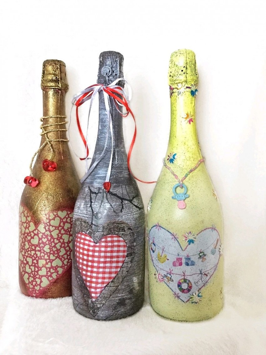 Материал для декора бутылок своими руками в домашних условиях подбирают, исходя из идеи и доступной техники.