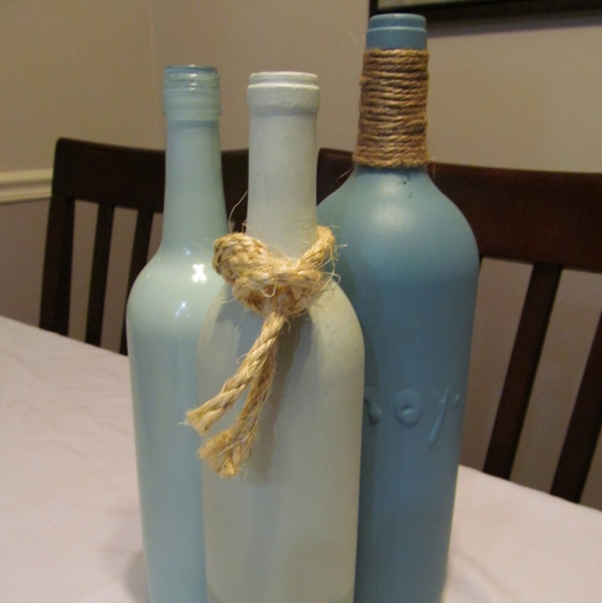 Простейший способ – декор стеклянных бутылок окрашиванием изнутри или снаружи. Для этого нужны прозрачные емкости разного объема. Если их выкрасить в один цвет, они будут выглядеть как сувенирный набор. Такие предметы можно соединять по 2-3, образуя «дуэты» и «трио». Лучше всего использовать декорированные бутылки в качестве вазонов под сухую икебану или искусственные цветы.