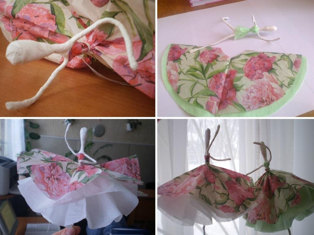 Балерины из салфеток, мастер класс по созданию которых был рассмотрен выше, украсят любой интерьер. Очень оригинально смотрится елка, украшенная такими фигурками. Можно подвесить их в дверном проеме или под потолком. Если подвесить группу таких балерин под люстрой, то от каждого дуновения ветра они будут танцевать. Каждой фигурке можно придать свою позу.
