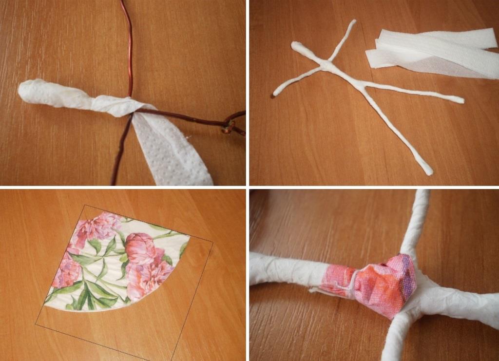 Начните обматывать проволочный каркас бумажными полосками, начинать лучше сверху. Чтобы зафиксировать салфетки и придать плотность туловищу, нужно смачивать материал клеем. В области головы и груди необходимо сделать несколько слоев, чтобы у балерины появилась изящная фигурка. В конце работы стоит промокнуть кисточкой, смоченной в клее, готовую «мумию» и положить ее просыхать.