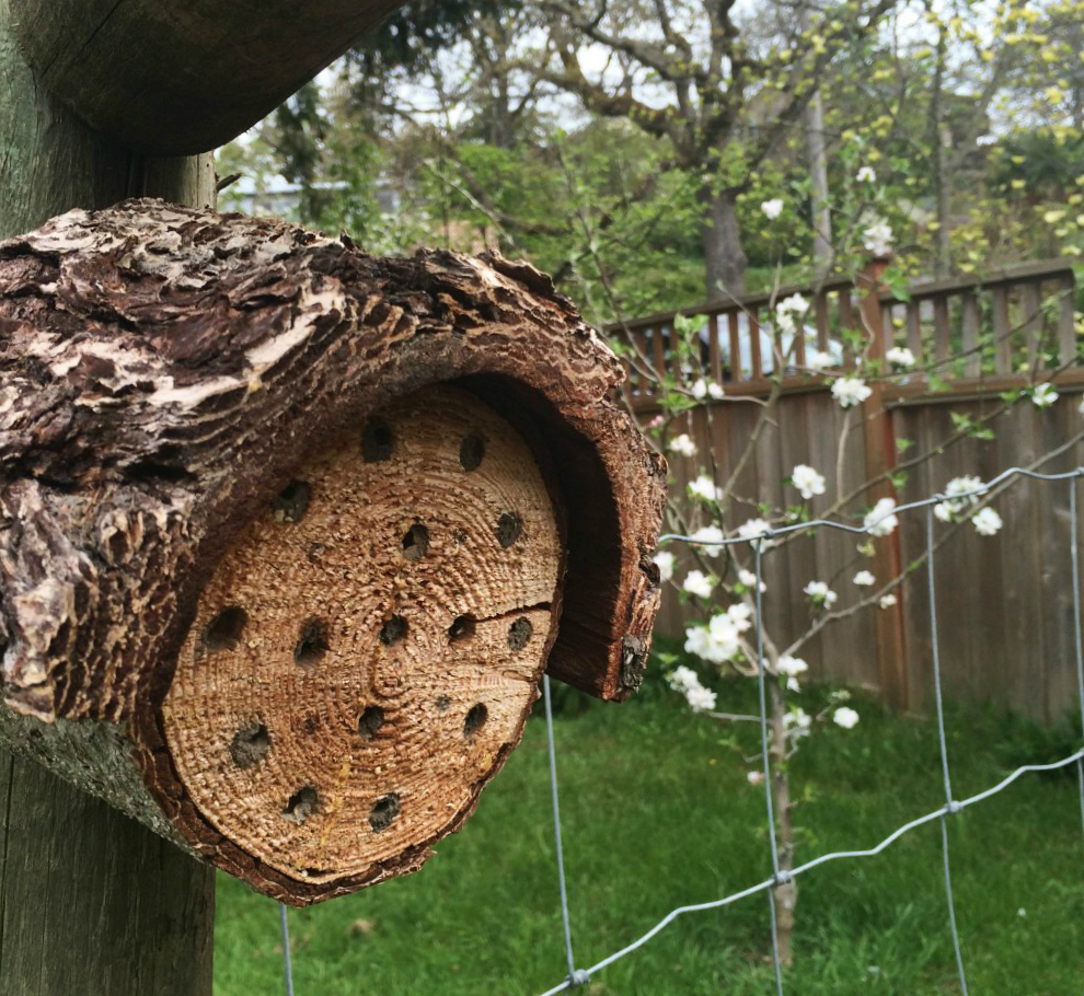 Например, смастерить пчелиную «гостиницу» можно, просверлив в трухлявом пне отверстия и подвесив его на дерево.