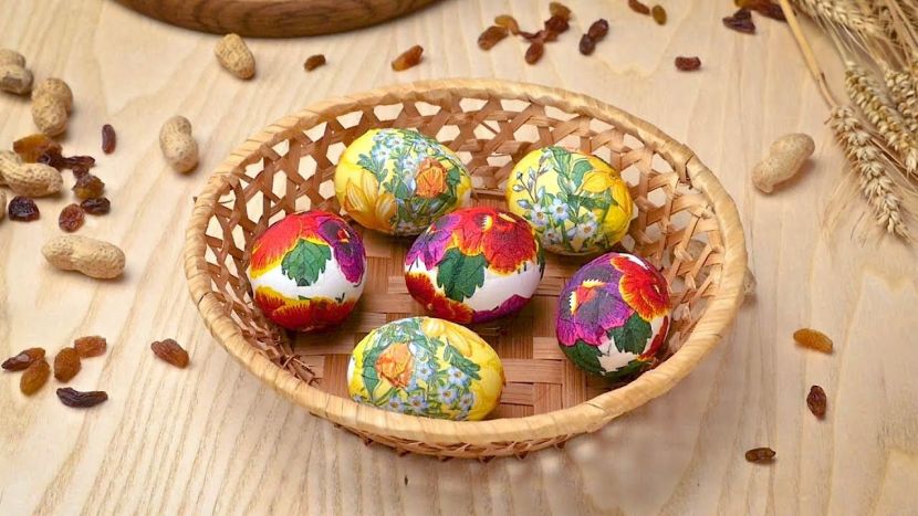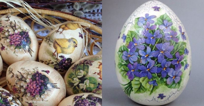 Интересным будет выглядеть двустороннее оформление яиц, при котором одна половина прокрашивается однотонно, а на вторую наносится декупаж.