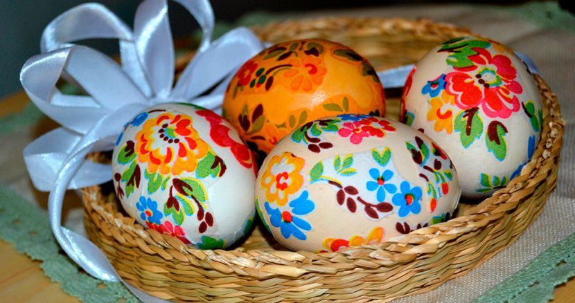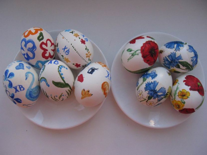 Сложнее всего изготовить писанки – пасхальные яйца, расписанные по особой технологии. Основные цвета орнамента писанок — белый, желтый, красный и черный. Линии развода обычно белые, а в тех случаях, когда фон писанки белый, — развод желтый. Фон писанки может быть также красный или черный. Яйцо, раскрашенное с нарушением законов письма, называлось уже не писанкой, а малеванкой. Настоящие писанки окрашивали только сырыми и для еды не использовали. После Троицы их принято было выдувать. Расписное яйцо превращали в птицу, приклеивая к скорлупе крылья.