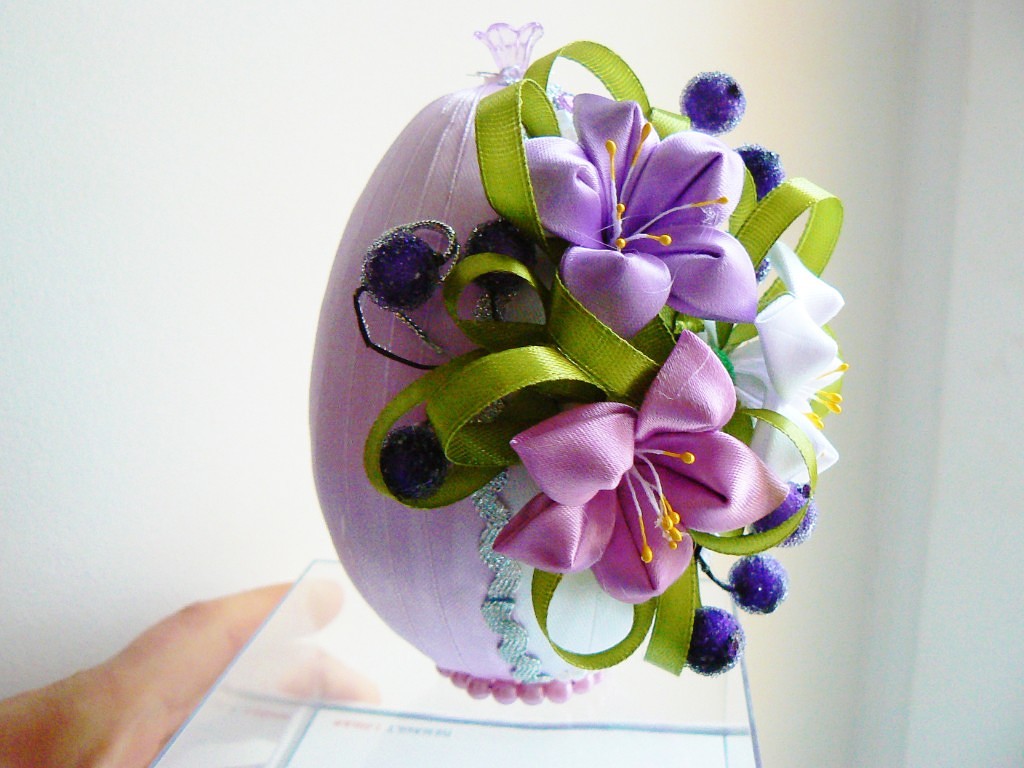 Очень красиво выглядит яйцо, украшенное лентами в технике канзаши