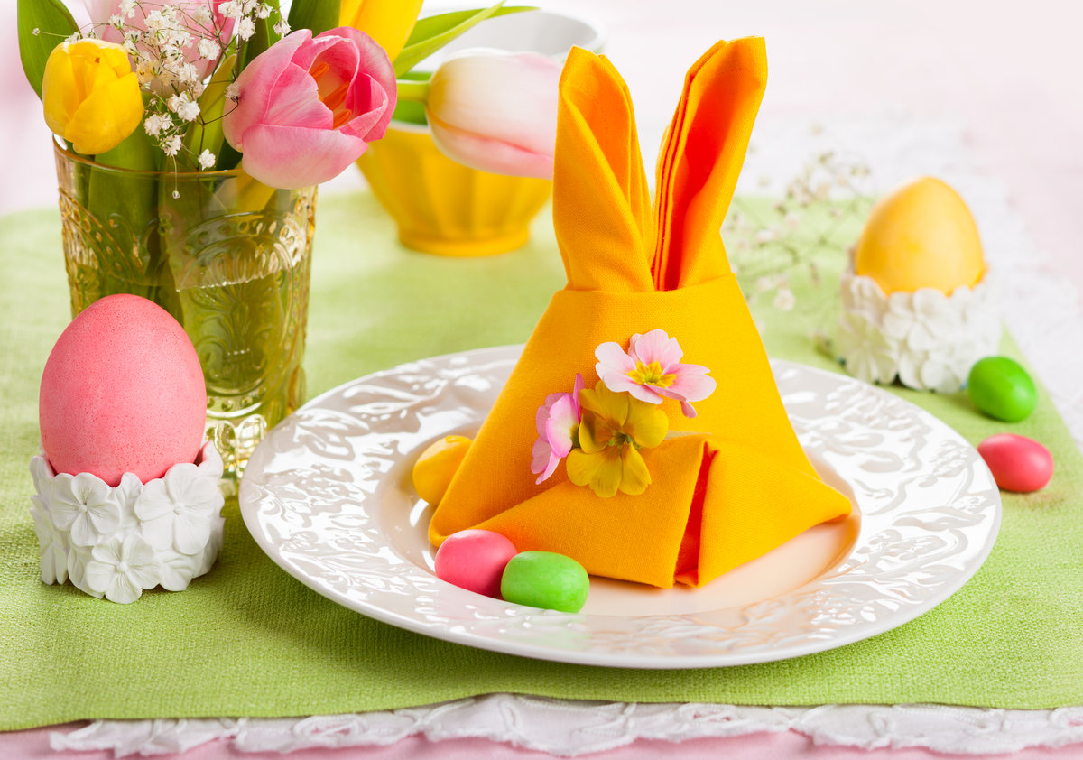 Поиграйте с палитрой: выберите салфетки в тон скатерти или отдайте предпочтение ярким и весенним цветам, например, розовому, голубому, салатовому.