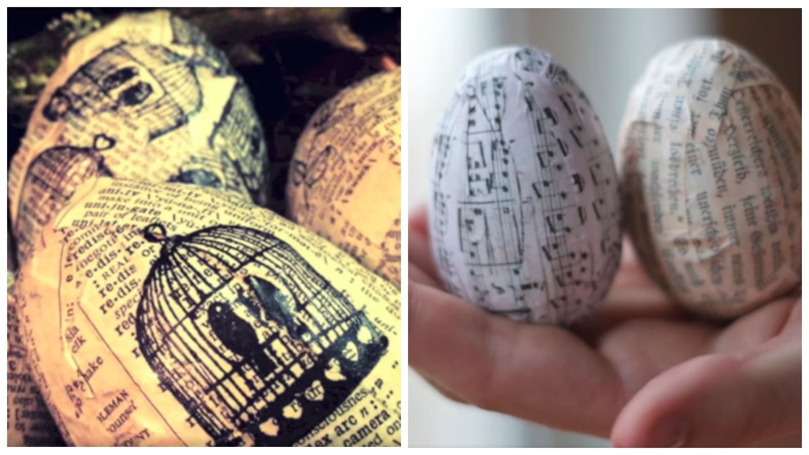 Еще один вариант – декупаж газетами. Выглядит привлекательно и оригинально. Рисунок получается будто под старину, если поверх газеты черной гелевой ручной нарисовать что-то. К примеру, клетку с птицей. Как вам? Гляньте на фото, как выглядит декупаж яиц газетами.