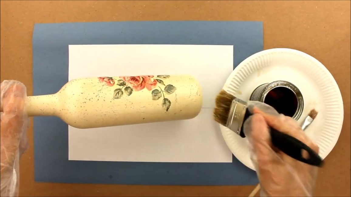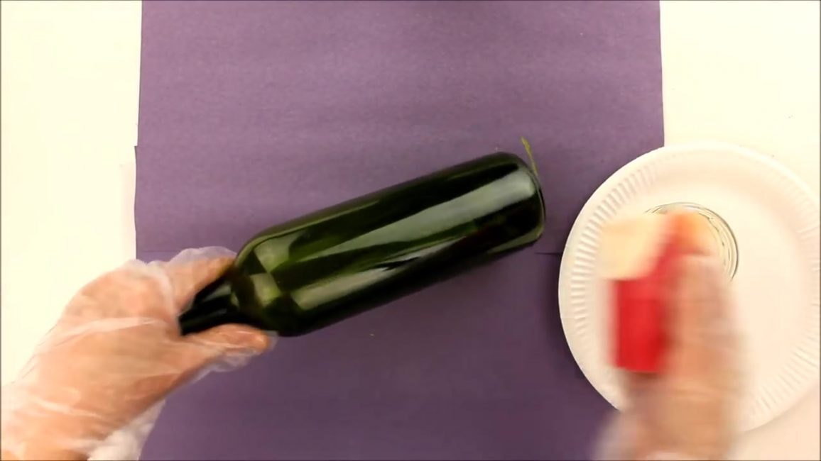 Теперь покройте бутылку акриловым лаком. Старайтесь сделать так, чтобы слой был ровным. Наносить лучше всего губкой