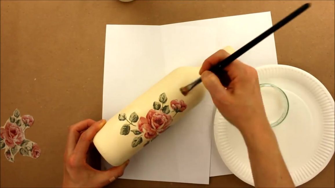 Сухим или мокрым способом соединяют салфетку с бутылкой. Главное, чтобы не остались воздушные пузырьки, а края были плотно приклеены. Для начинающих декупажистов рекомендуют использовать декупажный клей-спрей