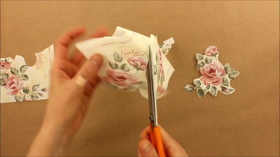 На этом этапе приступаем к нанесению рисунка с салфетки. Отделите верхний слой. Оборвите всё лишнее, стараясь при этом не допустить ровных краёв, которые затем сложно сделать естественными