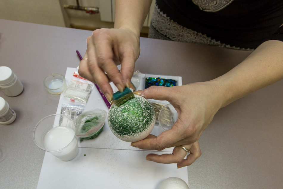 - Теперь очередь декупажного лака. Он позволит блесткам, которые будут наноситься позже, держаться на шарике лучше.