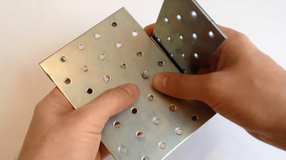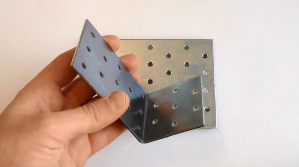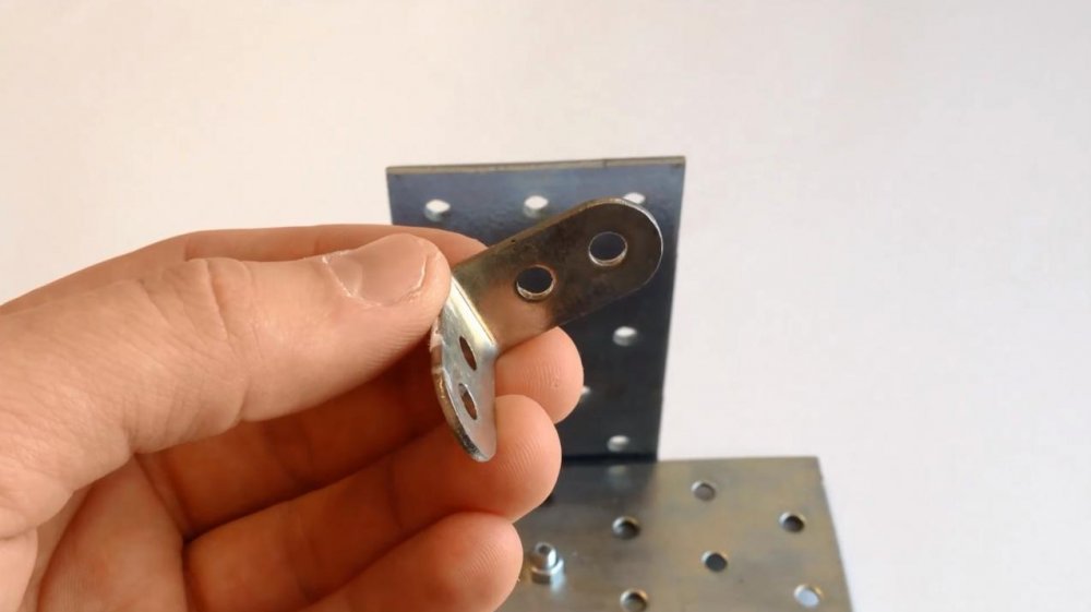 Следующим элементом будет кронштейн или уголок с разносторонними полками. Скрепляем короткую полку кронштейна и пластину-основание болтом с гайкой. Подтягиваем их плоскогубцами для надежности.