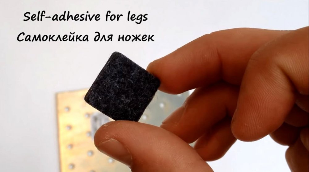 Плоскую перфорированную пластину обкладываем с тыльной стороны мягкими мебельными подпятниками. Их просто наклеиваем по углам прямоугольника.
