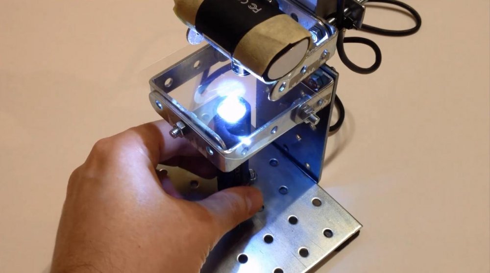 По желанию делаем специальный рабочий столик из пластика, оргстекла или другого подручного материала. Нелишним будет штатив с креплением, который облегчит использование самодельного прибора. Здесь можно включить фантазию.