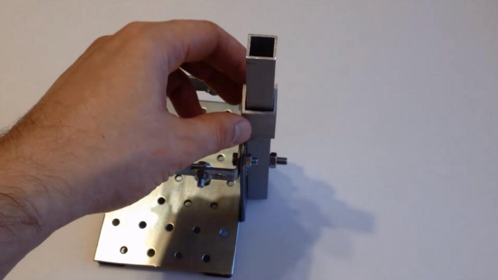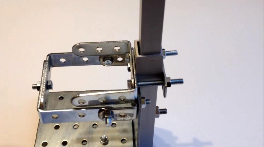 Из двух кронштейнов, совмещенных между собой внахлест, делаем открытую рамку. Болты выбираем подлиннее, чтобы их хватило на поджим этой рамки вокруг подвижного отрезка трубы. Насаживаем на них пластину с двумя отверстиями по бокам, и гайками фиксируем ее.