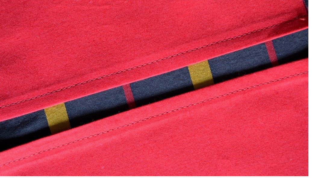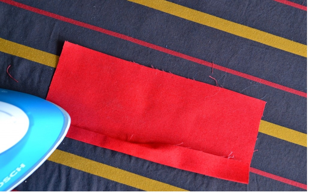 Берём два отреза ткани для карманов. На каждом подгибаем ткань по длине на 1,5 см — только с одной стороны! Проглаживаем сгиб утюгом.