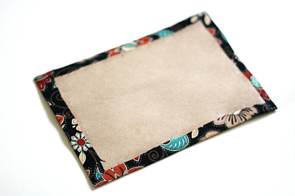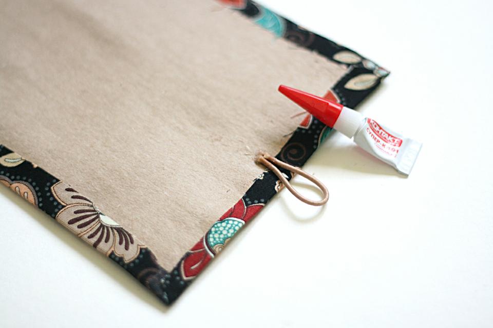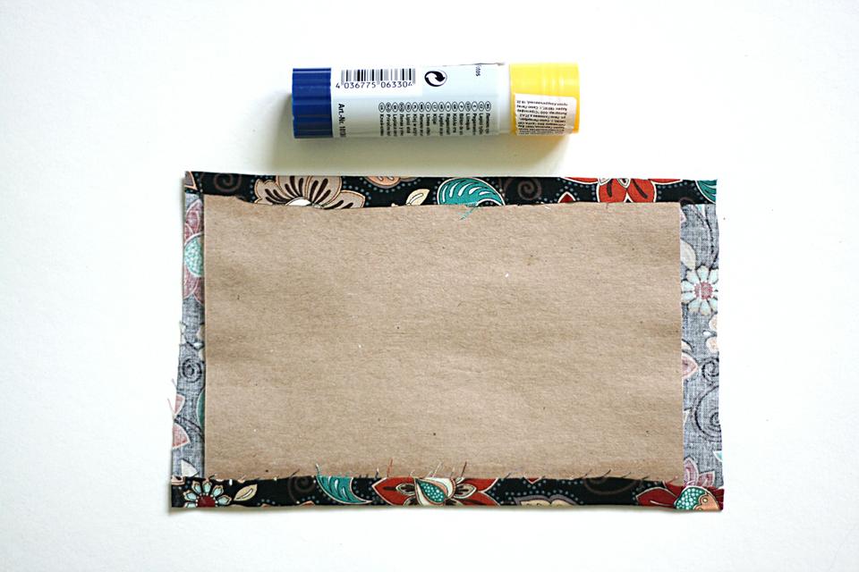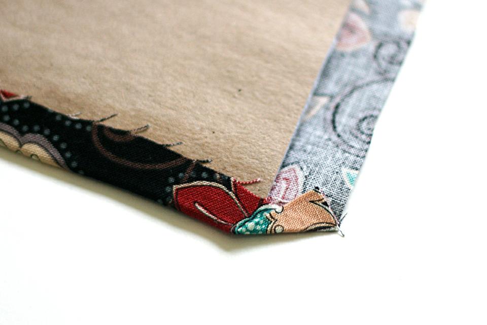 Срезаем уголок под углом в 45 градусов и приклеиваем на клей карандаш оставшийся уголок к ткани, параллельно картонной основы.