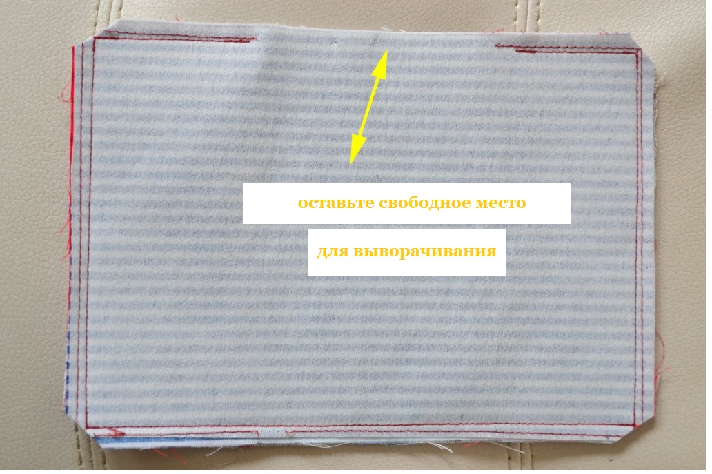 Складываем детали лицевыми сторонами внутрь. Прокладываем строчку по периметру деталей. В любом месте оставляем не прошитой часть стороны — для того, чтобы после вывернуть на лицевую сторону. Прокладываем еще одну строчку вдоль первого шва на расстоянии 0,5 см от края.