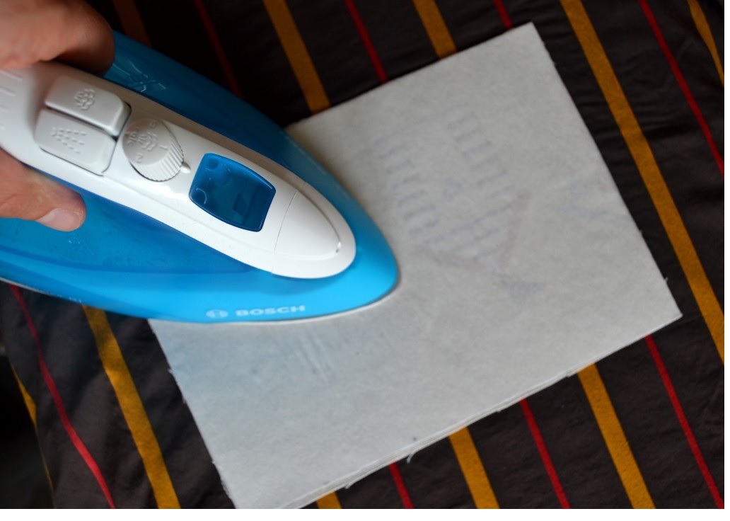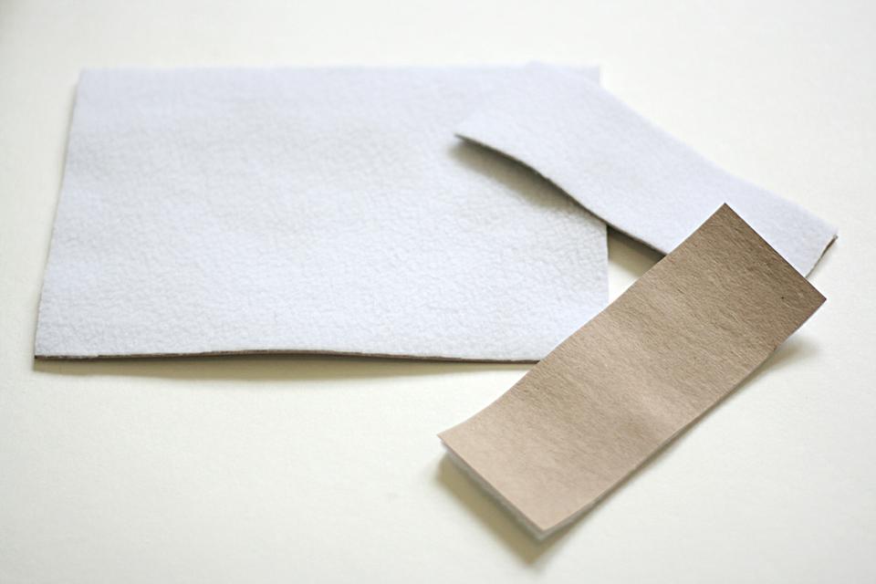 Если прокладочный материал без клеевого слоя, придётся приклеить его к ткани на двусторонний скотч. Если клеевой слой присутствует — прекрасно, просто прогладьте его утюгом для склеивания с поверхностью ткани.