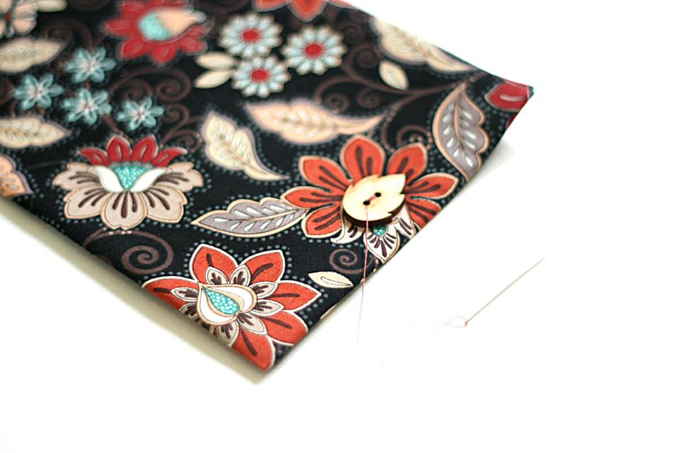 Теперь пришиваем пуговичку на лицевую сторону обложки посередине одной из коротких сторон.