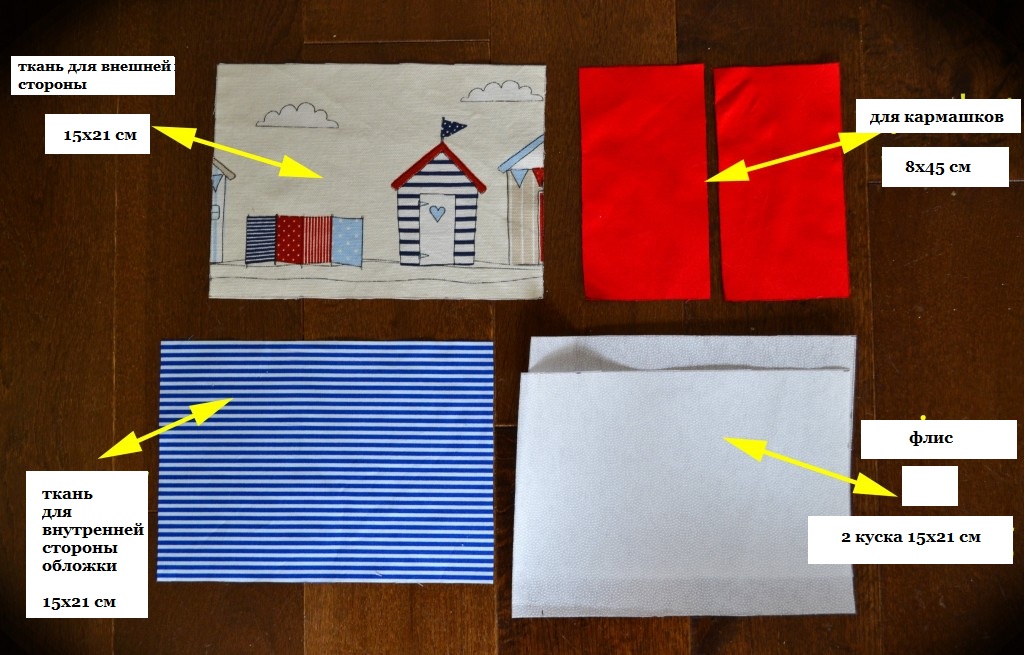 К лицевой стороне ткани для внутренней стороны обложки прикладываем карманы. Пристегиваем булавками, чтобы удержать их на месте.