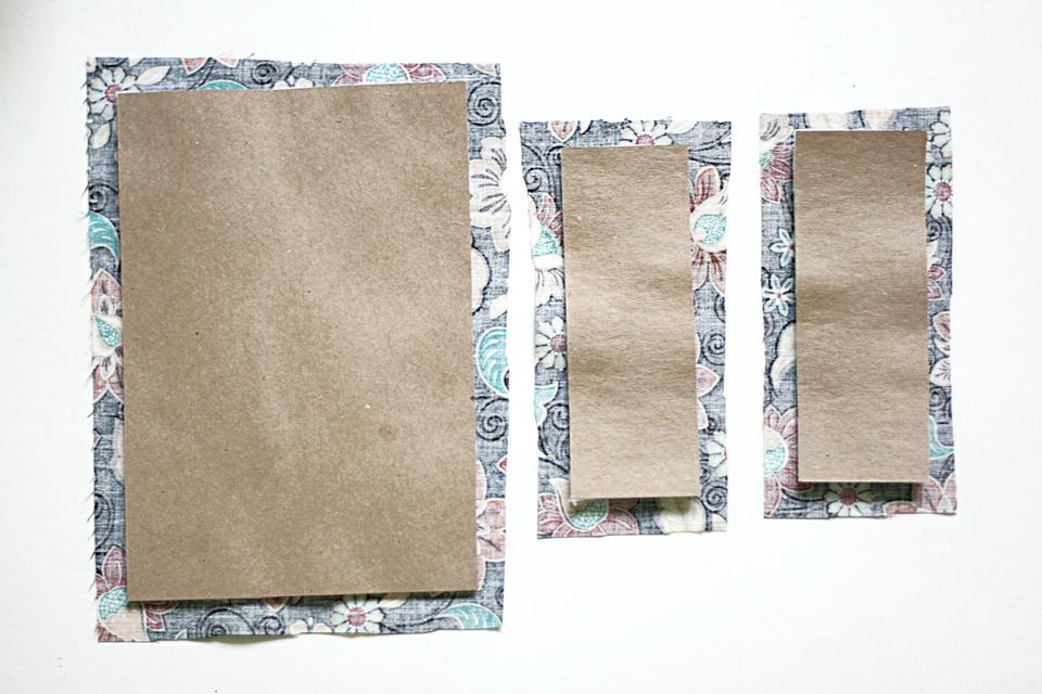 Вырезаем из флизелина прямоугольник равный размеру основы. Так же вырезаем из ткани прямоугольник, но прибавляем на подгибку 1,5 см. И приклеиваем флизелин по центру с помощью утюга